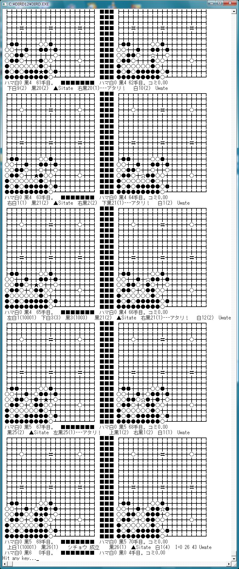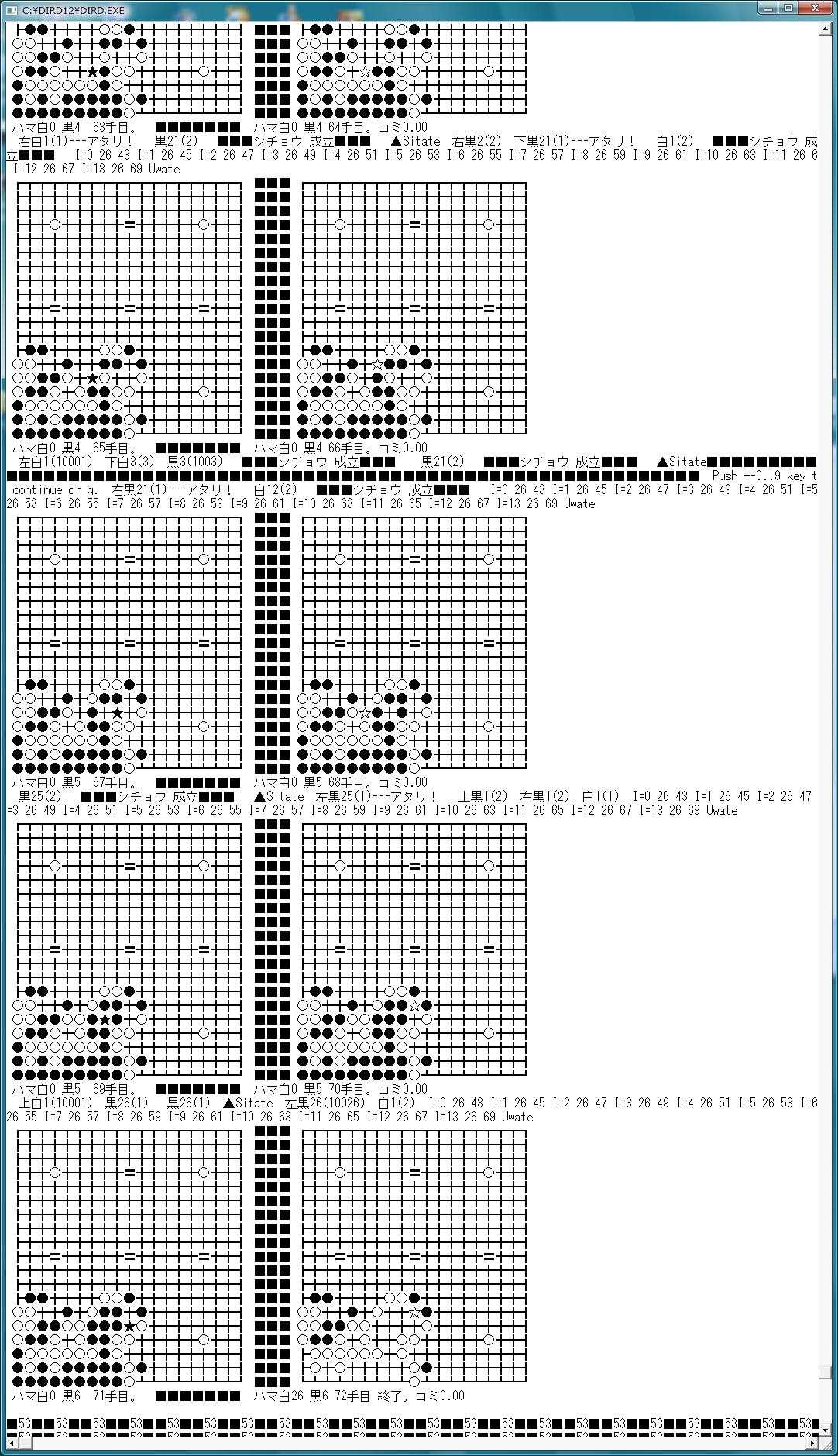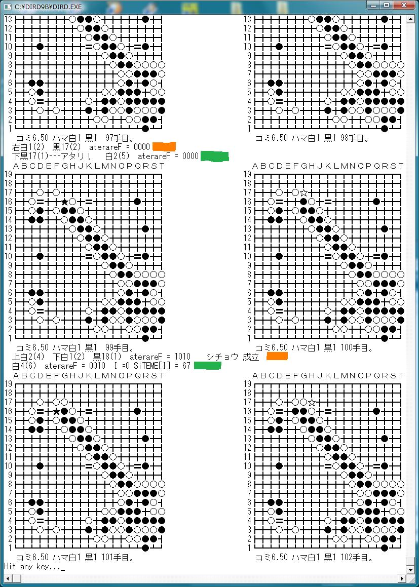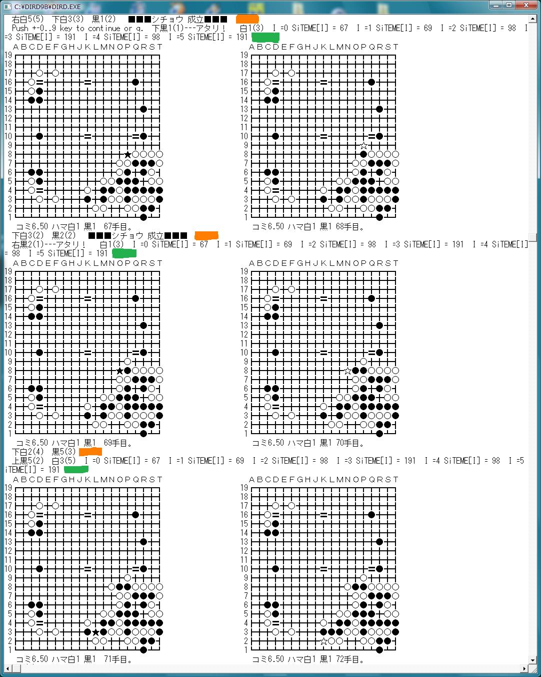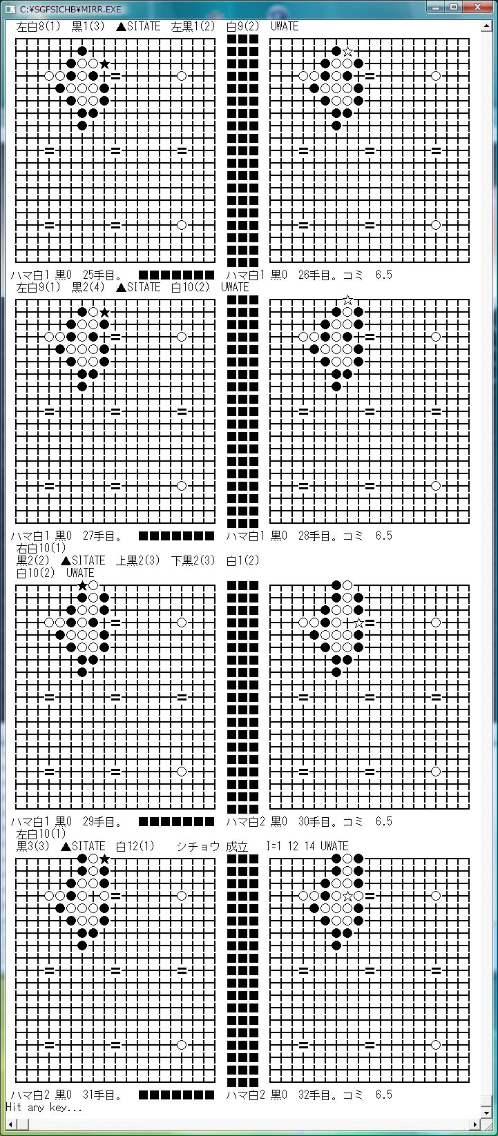 WinXP Pro SP3で、KGS棋譜ファイル(.sgf形式)テキストファイルの閲覧後、+ - q 以外のキ−を押して、19路盤表示中、■■■シチョウ 成立■■■ 表示。